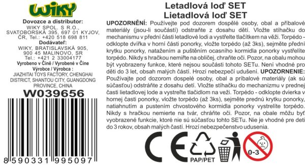 Letadlová loď s katapultem 25 cm set s ponorkou. Obsah balení - letadlová loď na setrvačník s katapultem na stíhačky 25 cm, ponorka s vystřelováním torpéd 28 cm na setrvačník, letadlová loď 18 cm, bitevní loď 16 cm, bitevní křižník 14 cm, 3x stíhačka volná kola 12 cm, 3x stíhačka katapultovací 7 cm, 12x torpédo do ponorky. Katapult - vložte stíhačku do pružiny v přední části letadlové lodě, vystřelení tlačítkem na věži. Torpédo - odklopte dvířka v horní části ponorky - vložte torpédo (max 3), sejměte přední krytku ponorky, natažením a puštěním ocasního kormidla ponorky vystřelíte torpédo. Obrázkový návod na obalu.