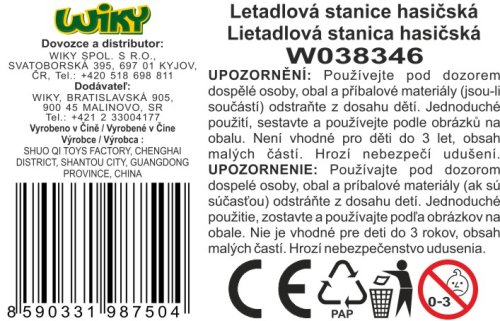 Letadlová stanice hasičská. Rozměry 30x29x14 cm. Součástí 4 auta, 1 vrtulník. Volná kola. Obsahuje letadlovou stanici, 4 malé dopravní prostředky, dráhu, heliport, značky, kužely. Obrázek na sestavení na boční straně obalu.