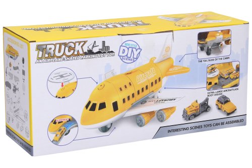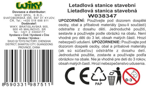 Letadlová stanice stavební. Rozměry 30x29x14 cm. Součástí 4 auta, 1 vrtulník. Volná kola. Obsahuje letadlovou stanici, 4 malé dopravní prostředky, dráhu, heliport, značky, kužely. Obrázek na sestavení na boční straně obalu.