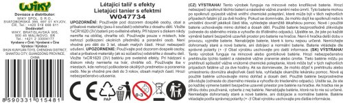 Létající talíř. Vydává světelné efekty. Rozměry talíře 23x23x2,5 cm. Baterie 1x3V součástí balení.