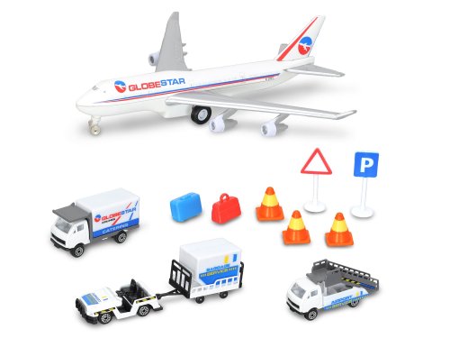 Hrací set s letištní tématikou. Obsahuje letadlo, 2 auta zajišťující servis na letišti a auto cateringu. Auta kovová s plastovými díly, na volnoběh. Nezbytné příslušenství součástí