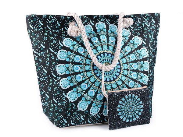 Velkou bavlněnou tašku s potiskem mandaly využijete při cestě na koupaliště i na pláž. Díky rozšířenému dnu dobře stojí. Součástí je i malá taštička na drobnosti ve stejném designu, která je připevněná k uchu. Pokud její poutko provléknete dírkou u ucha tašky, můžete ji sundat a nosit samostatně. Taška je prostorná - vejde se do ní vše, co potřebujete. Uvnitř se nachází polyesterová podšívka s malou kapsičkou. Nahoře se dá taška uzavřít pomocí zipu. Díky velkým uchům z kroucené šňůry můžete nést tašku pohodlně v ruce i na rameni. Potisk na tašce i taštičce je pouze na přední straně, zadní strana je přírodní.