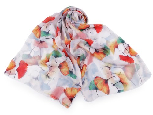 Šátek s oblíbeným vzorem listů ginkgo je vzdušný a lehounký, velice příjemný na dotek. Je jemně průsvitný, na koncích má malé třásně. Doladí váš outfit, ať už si vezmete sako, halenku, svetřík či šaty. Šátky mají špatné štítky, skutečné složení je 100% polyester. Omlouváme se za toto nedopatření a děkujeme za pochopení.
