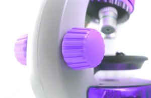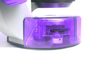 Světlo vydávané LED diodami (umístěnými pod stolkem) prochází preparátem a