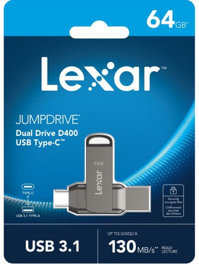 Lexar® JumpDrive® Dual Drive D400 USB 3.1 je flash disk 2 v 1, který umožňuje bezproblémový přenos obsahu mezi zařízeními USB Type-C a Type-A.