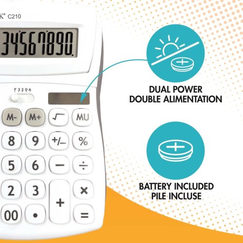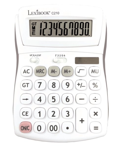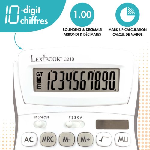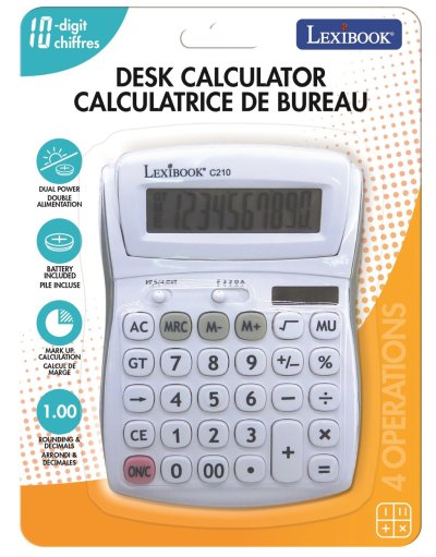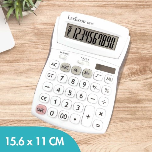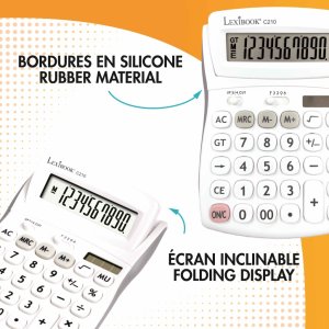 Kalkulačka Lexibook C210 je stolní model s deseti místným displejem, který umožňuje pohodlné zobrazení až deseti číslic najednou. Displej je sklopný, což umožňuje nastavit jeho úhel pro lepší čitelnost a ergonomii během práce. Tělo kalkulačky je vyrobeno z plastu v bílé barvě s gumovými okraji zajišťujícími lepší uchopení a odolnost proti nárazům. Celkové rozměry kalkulačky jsou 15,6 x 11 cm, což ji činí dostatečně kompaktní na pracovní stůl, ale stále pohodlnou pro ovládání.