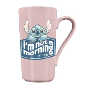 Na hrnku jsou z obou stran umístěny roztomilé ilustrace postaviček z filmu – na jedné straně je modrý Stitch, na druhé straně růžový experiment 625, známý jako Angel. Obě postavičky jsou umístěny nad nápisem „I'm not a morning alien“, což hrnek dotváří vtipným a originálním způsobem, který osloví jak děti, tak dospělé. Uvnitř hrnku je pak na okraji natištěno logo „Disney Stitch“, které podtrhuje oficiální licencovanou kvalitu produktu.