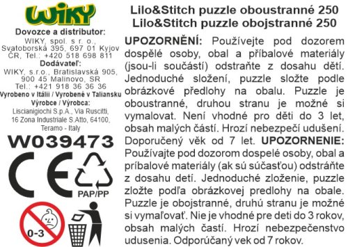Lilo & Stitch Puzzle oboustranné 50x35 cm 250 dílků. Na jedné straně je barevný potisk. Na druhé straně je obrázek určený k vymalování.