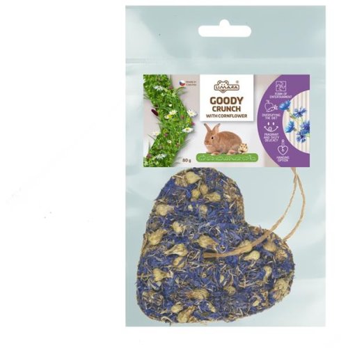 Bezobilné bylinkové srdce s chrpou poskytne králíkům a hlodavcům zdravou odměnu, zábavu a příjemné zpestření jídelníčku. Sušené květy chrpy podporují trávení, přirozené čištění organismu a zdraví močových cest. Pamlsek lze díky přírodnímu provázku zavěsit do ubikace. Hlavní přednosti:
