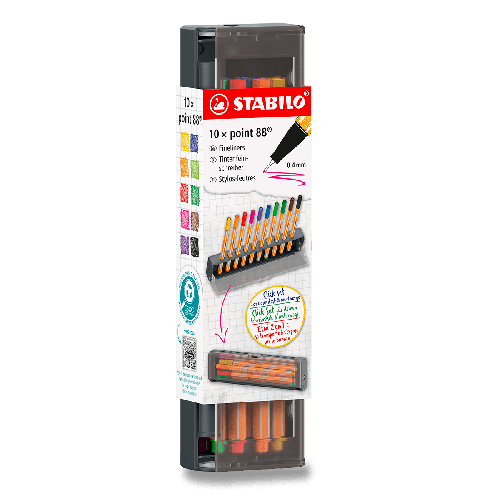 ŠÍŘE STOPY 0,4 MM., * vhodný pro psaní i rýsování podle šablony nebo pravítka, * oranžový šestihran s bílými proužky na hranách, známý po celém světě, * hrot zasazený v kovovém pouzdře pro dlouhou životnost, * prodyšné víčko v barvě inkoustu, * praktické uzavíratelné pouzdro, * certifikace ISCC PLUS: pro výrobu těla a víčka produktu bylo použito 96 % plastu na biologické bázi (hmotnostní bilance), [liner 0,4 mm], Jemná linka a nezaměnitelný tvar a barva těla STABILO point 88 jsou známkou PRECIZNOSTI a ŠIROKÉ ŠKÁLY BAREV. Ne nadarmo je na trhu v Evropě STABILO point 88 číslem jedna. Jeho hrot, zasazený do kovového pouzdra byl nesčetněkrát zdrojem skvělých nápadů a důmyslných myšlenek; ať už v práci, ve škole, v každodenním životě nebo ve chvílích kreativity - STABILO, point 88 je vaším dokonalým společníkem