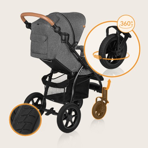 Také pro novorozence!: V kočárku lze bezpečně vozit děti ihned po narození! Sedadlo se dá složit naplocho (vznikne tak velký prostor dlouhý až 90 cm!) a speciální redukční vložka pro nejmenší děti zaručuje anatomicky správnou polohu, pohodlí a bezpečnost. Voděodolná boudička XXL s filtrem UPF50+: Zajišťuje dítěti dostatek místa a účinně chrání proti slunci, větru nebo dešti. Má přídavný, rozepínatelný panel, kukátko a reflexní prvky. UPF50+ je nejsilnější protisluneční filtr nasazovaný na tkaniny. Velká, bezúdržbová kola: Jsou vyrobena z polyuretanu, kombinují jízdní komfort s odolností. Je to materiál, který se prakticky neopotřebovává. Jsou protektorovaná a umožní vám pohodlnou procházku v každém terénu, nepropichují se a není třeba je foukat. Přední kola se otáčejí o 360°. Velmi dobré odpružení: Je to kočárek, se kterým nebudete cítit každý kámen na cestě – právě naopak. Nezávislé odpružení předních a zadních kol přispívá k tomu, že dítě (a jeho rodiče) pociťuje o mnoho méně otřesů a procházka je pohodlná. Jednoduché udržování čistoty: Opěrka nohou je potažena ekokůží v místě, kde se obvykle nacházejí boty dítěte, aby bylo možné jednoduše odstranit veškeré nečistoty. Potah kočárku a koš můžete prát v ruce. Prostorný koš: Koš pod kočárkem je prostorný a snadno přístupný, díky čemuž se kočárek osvědčí při nákupech. Reflexní prvky a příslušenství: Reflexní prvky na opěrce nohou, madlu a stříšce výrazně zlepšují viditelnost na silnici a zvyšují tak bezpečnost. V sadě s kočárkem dostanete také moskytiéru, držák na hrnek, redukční vložku a ochranný potah na nohy. Vhodný také pro vyšší osoby: Rukojeť kočárku má až 9 stupňů nastavení, což umožňuje rodičům přizpůsobit její polohu své výšce, aby procházka byla pohodlnější a zdravější pro páteř.