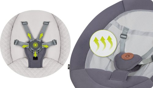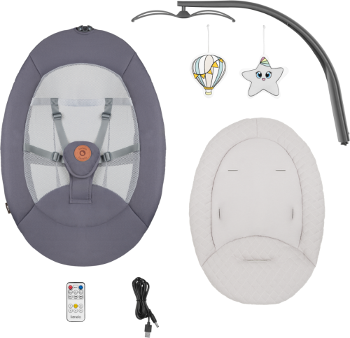 profilované otočné sedadlo s měkkým polštářkem a síťovaným potahem nízká hmotnost = snadné přenášení nastavení sklonu opěradla do 2 poloh (poloha vleže nebo pololeže) automatická detekce pohybu 5 rychlostí houpání dva směry houpání: vpřed-vzad, vlevo-vpravo vestavěný časovač na 8,15 nebo 30 minut přehrávání 12 melodií, ovládání hlasitosti ovládání pomocí dotykového panelu nebo dálkového ovladače 2 způsoby napájení: baterie nebo ze sítě pomocí přes USB kabel (součástí balení 1,2m) pro provoz je třeba 4 ks 1,5V baterie AA,LR6 (nejsou součástí balení) odnímatelná hrazdička se 2 hračkami snímatelný potah lze prát v pračce max na 30°C* 5-bodové bezpečnostní pásy protiskluzové kryty - chrání podlahu proti poškrábání.