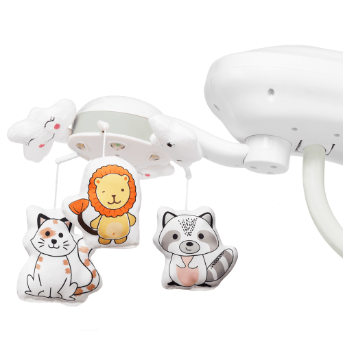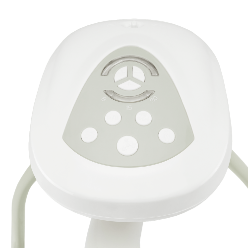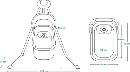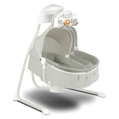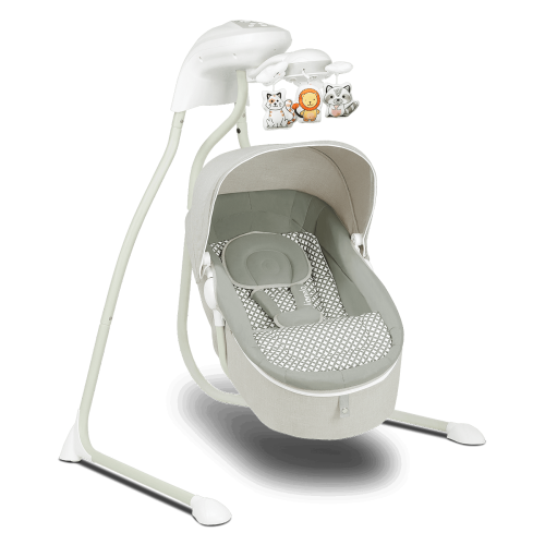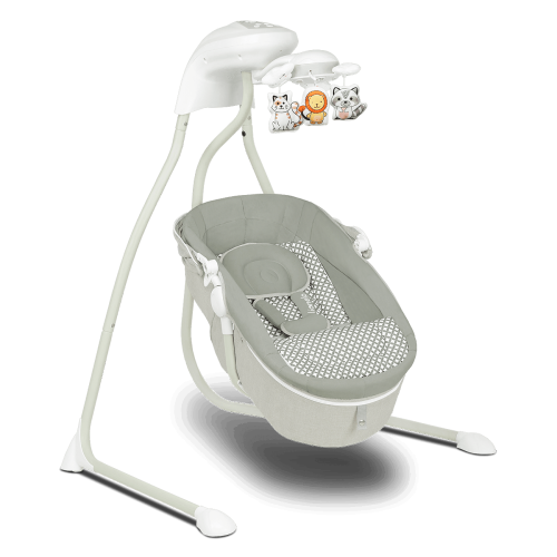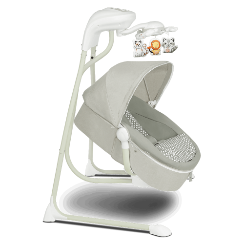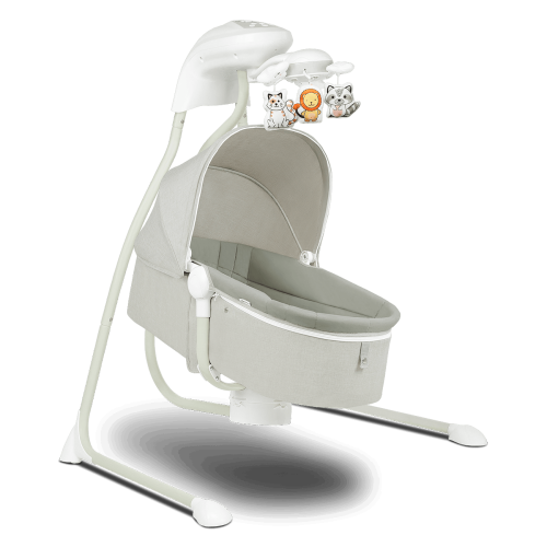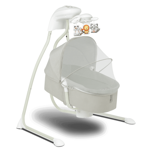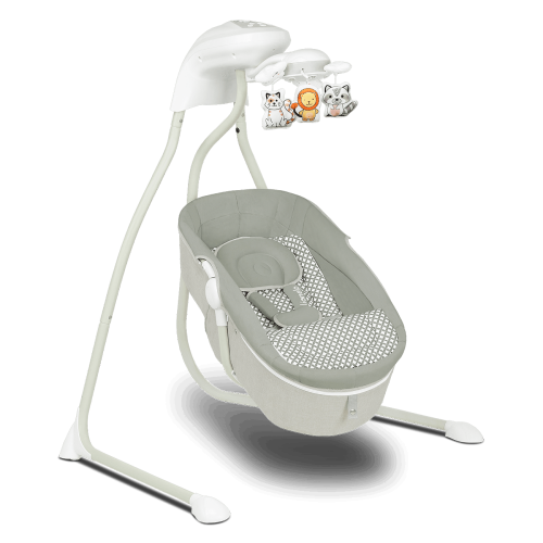 Pevný a stabilní ocelový rám, 3 nastavitelné polohy houpátka - z ležící do sedící, tiché houpání, otočení korbičky houpátka až o 115°, měkká vložka a odnímatelné polstrování (lze prát ručně), 5ti-bodové bezpečnostní pásy, kolotoč s hračkami a světýlky, MP3 přehrávač s 12 melodiemi a zvuky přírody včetně USB, časovač houpání, napájení 2 způsoby: přiloženým napájecím zdrojem nebo 4 bateriemi D+ R20 1,5 V (baterie nejsou součástí výrobku), moskytiéra.