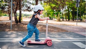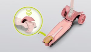 tříkolová pro lepší stabilitu ergonomický tvar 4stupňové nastavení výšky řídítek (64,68,72,76) plošina s protiskluzovou úpravou brzda integrovaná do zadní nápravy přední kola: 12" zadní kolo: 8" ložiska: ABEC-7 veselé barvy LED světla v kolečkách napájená při pohybu LED světla v plošině napájená bateriemi vhodné pro domácí i venkovní použití