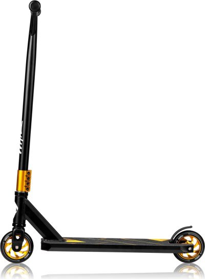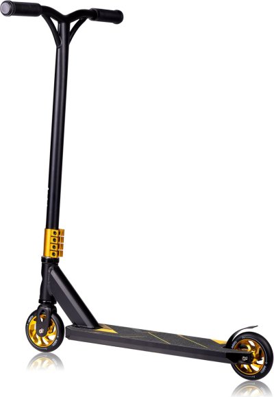 lehký hliníkový rám kompresní systém HIC zajišťuje pevné spojení mezi vidlicí a sponou odolná kolečka o průměru 11 cm ergonomická jednodílná Y-bar řídítka se sponou se 4 otvory speciální gumové rukojeti zabraňují sklouzávání rukou protiskluzová prostorná deska a brzda na zadním kole ložiska ABEC-9 v kombinaci s polyuretanovými koly zvyšují rychlost jízdy