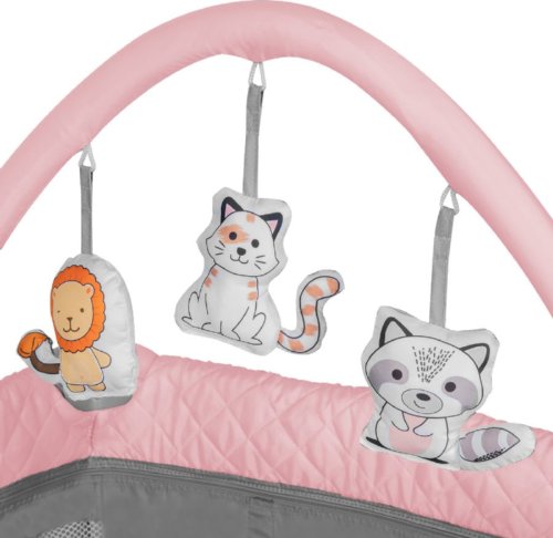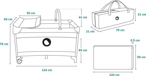 2v1 = postýlka a ohrádka, snadné skládání a rozkládání, přebalovací pult se zvýšenými okraji, kapsy a přihrádky na různé potřeby, oblouk s hračkami, boční vchod se zipem, 2-úrovňové nastavení výšky matrace, matrace 120 x 60 x 5 cm z pěny se zvýšenou pružností, zámek LockGuard proti samovolnému složení, 2 kolečka pro snadné přemisťování, praktická přepravní taška na cesty.
