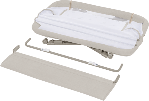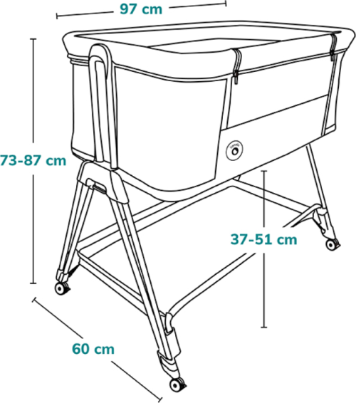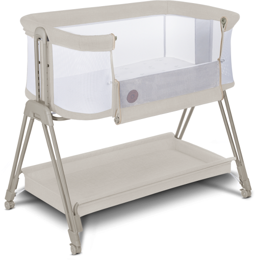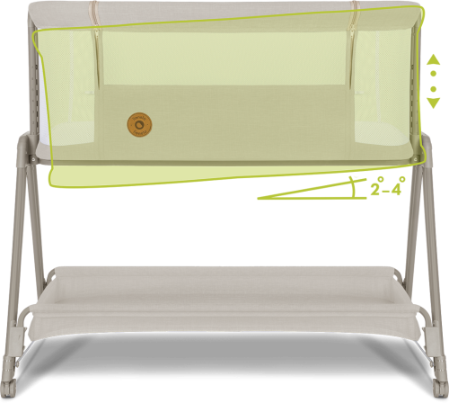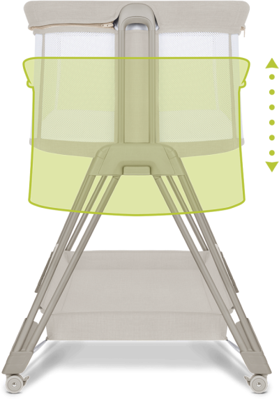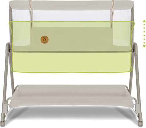 průhledná prodyšná síťovina 6 úrovní nastavení výšky nastavení sklonu boční otevírací strana snadné přemisťování postýlky díky 4 kolům se zámkem prostorný koš měkká tkanina snímatelný a pratelný potah i matrace