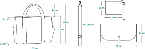 rozměry: 53 x 31 x 23 cm objem 20 l 100% polyester zapínání na zip vnější kapsy: 2 kapsy na zip, 2 postranní kapsy pro doplňky vnitřní prostor: 1 velká kapsa na zip, 1 velká kapsa na suchý zip, 2 kapsy na láhve ramenní popruh pro praktické přenášení pásky pro připevnění na rukojeť kočárku obsahuje: přebalovací podložku a toaletní tašku