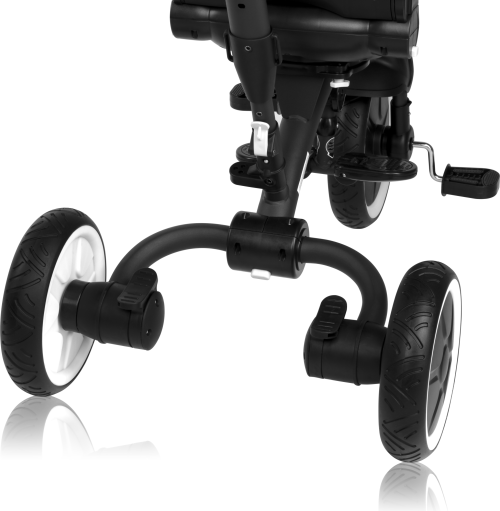 otáčecí sedátko s polstrováním na celé ploše 3bodové bezpečnostní pásy pro malé děti protiskluzová rukojeť se zvonkem součástí je prostorná taška na potřebné věci a držák na nápoje pod řídítky jednoduché skládání do kompaktní velikosti brzda na zadních kolech Výškově nastavitelná rukojeť pro rodiče: 80 - 100 cm Volně otáčející se kola Podnožka pro nejmenší děti Podnožka pro starší děti Nastavitelná opěrka zad Nastavení sedadla vpředu,vzadu Zadní kola s nezávislými brzdami Reflexní lemování na stříšce Extra polstrování na sedadle a opěradle velikost předního kola 26 cm velikost zadních kol 23 cm Nastavení opěradla ve 3 pozicích