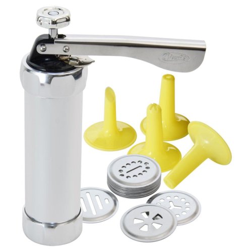 Lis na těsto - zdobičku využijete jak při pečení nejrůznějších sušenek, tak pro zdobení dortů či chlebíčků. Součástí je 20 různých kovových nástavců a 4 plastové zdobící nástavce. Jednoduchá manipulace pomocí pístu, dávkování těsta na cukroví pomocí krokovacího systému táhla pístu.