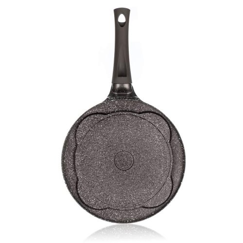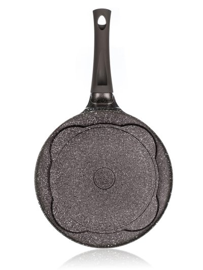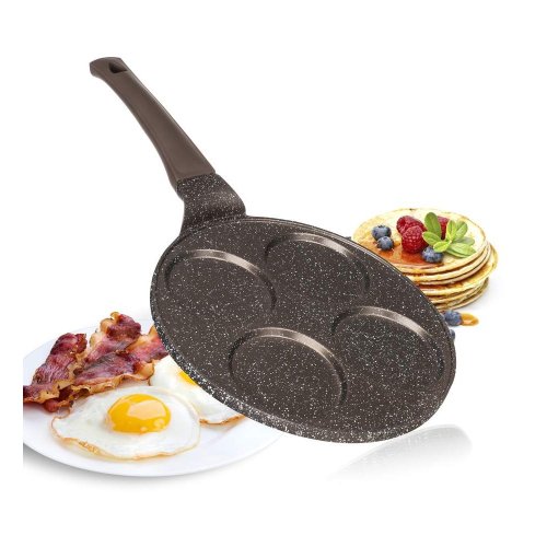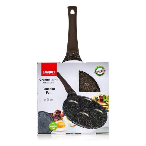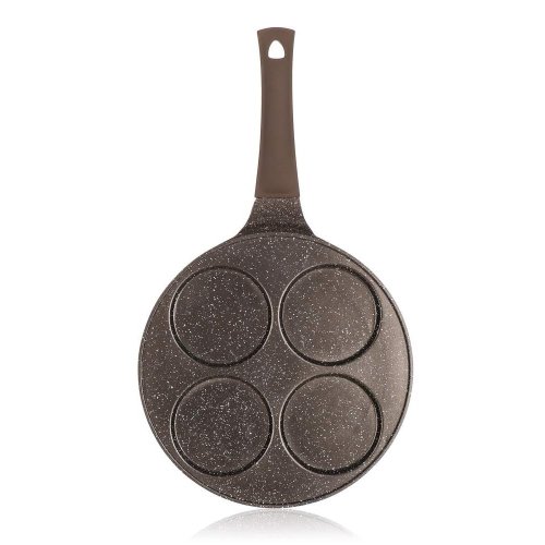 Hliníková pánev Granite Dark Brown na 4 lívance má kvalitní vnitřní nepřilnavý povrch a ergonomickou plastovou rukojeť se soft-touch povrchovou úpravou. Pánev je vhodná na všechny typy varných desek, včetně indukce. Lívance, volská oka nebo bramboráčky na ní připravíte s minimem tuku.
