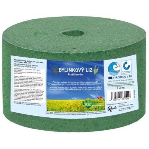 Minerální doplňkové krmivo pro koně, skot, ovce, kozy a lesní zvěř proti střevním parazitům. Bylinkový minerální liz proti červům pomáhá vytvářet v trávicím traktu nepřátelské prostředí pro střevní parazity. Minerální liz proti červům je obohacen speciálně vyvinutou bylinnou směsí a přirozeně tak posiluje střevní prostředí a přispívá tak k jeho odolnosti napadení endoparazity. Kromě soli, minerálních látek a stopových prvků obsahuje byliny s vysokým obsahem hořčin a tříslovin. Přesně takové byliny vyhledávají zvířata v přírodě při problémech se začervením. U divoce žijících druhů zvířat tyto látky, které jsou obsaženy v rostlinách, pomáhají snížit nadměrné nebo patologické začervení prostřednictvím vhodné výživy. Podpora přirozené obranyschopnosti trávicího traktu může pomoci prodloužit interval pravidelného odčervování. V žádném případě ale není jeho náhradou. Přípravek není doping dle pravidel FEI. Vlastnosti: