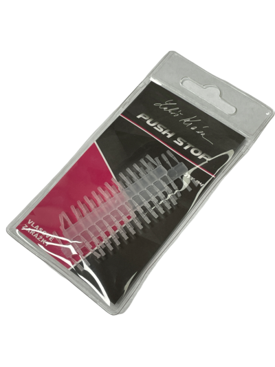 Pushstops nabízejí velmi snadný a rychlý způsob nastražení nástrahy na vlasový přívěs. Tyto vysoce kvalitní zarážky jsou precizně tvarované, jedna přesně jako druhá, aby vždy ideálně pasovaly k nástraze. Každé balení obsahuje 84 kusů zarážek vhodně uložených tak, aby držely spolu a nepoztrácely se. Jsou ideální pro použití s měkkými nástrahami, jako je kukuřice, maso, měkké peletky atd. U tvrdších nástrah, jako jsou pelety a boilies, použijte nejdříve vrtáček PUSH STOP DRILL, který v nástraze vytvoří otvor ideální velikosti. Jedná se o nejjednodušší a nejrychlejší způsob, jak nastražit nástrahu na vlasový přívěs. Čirá barva.