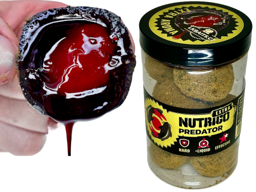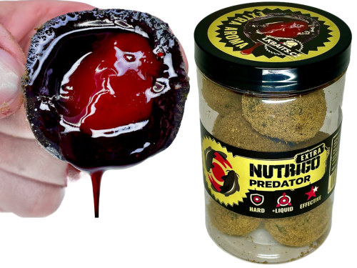 Absolutní novinka na rybářském trhu, která je určena pro lov trofejních ryb. Nástraha je vyrobena speciální technologií za použití přírodních sloučenin, které se z nástrahy postupně uvolňují a lákají trofejní ryby na velkou vzdálenost. NUTRIGO PREDATOR bylo vyvinuto primárně pro lov sumců, kde hlavními složky jsou tekutá játra, tresčí olej, krev a jiná aditiva stimulující predátory. Základem této originální tekutiny je léty ověřený výrobek PREDATOR. Nyní máte velkou dávku této ne zrovna vonící látky uvnitř mega nástrahy! POZOR! NUTRIGO PREDATOR je velmi lákavou nástrahou také pro trofejní kapry, jesetery a vyzy velké! Nutrigo PREDATOR propíchněte jehlou a klasicky navlékněte na vlas pod háček (doba účinku je až 24 hodin). Pro rychlejší uvolňování tekutiny zevnitř nástrahy doporučujeme nástrahu napíchat jehlou nebo provrtat tenkým vrtáčkem. Použijte peletovou zarážku. Ruční výroba. Patentově chráněno. Uvedený průměr je orientační. Na povrchu nástrahy se může vyskytovat tekutina. Nástraha může měnit barvu. Dostupné ve 30 mm a 45 mm!