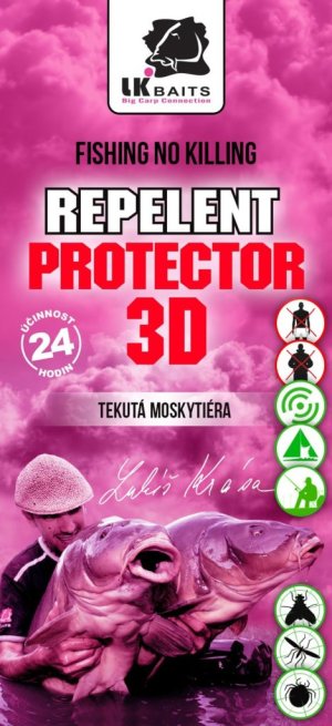 3D Protector (tekutá moskytiéra – přírodní aroma) Absolutní novinka na trhu pro rybáře, myslivce a všechny, kteří milují nerušený pobyt v přírodě. Nová generace ochrany před nepříjemným a nebezpečným hmyzem. 3D Protector, tzv. tekutá moskytiera Vás ochrání bez nanesení látky na tělo! Perfektně účinkuje proti: komárům, klíšťatům, muchničkám, mouchám, čmelíkům, potemníkům, molům, mravencům, štěnicím a dalšímu dotěrnému hmyzu. Určený k ošetření vnitřních i venkovních prostor. Použití: Predátor 3D je vynikající repelent - insekticid (nejen odpuzuje, ale i likviduje bodavý hmyz) pro použití všude tam, kde setrváváte na jednom místě a nechcete si stříkat jiný repelent přímo na pokožku či oděv. Postříkejte stejnoměrně okolo sebe na dosah ruky v kruhu porost, nebo zem. Popřípadě postříkejte část země okolo bivaků. Účinek se dostaví po krátké chvíli. U silného zamoření komáry či klíšťaty případně stříkněte i na porosty v dosahu nad sebou - větve, keře, aj. - nevdechujte rozprášený aerosol, počkejte mimo ošetřovanou plochu, dokud se neusadí! Vytvoříte si tak okolo sebe prostor bez bodavého hmyzu. Účinek vydrží až 24 hodin! Déšť jej však zkracuje, záleží na jeho intenzitě. Laboratorně a terénně testováno Státním zdravotním ústavem v Praze, kde byl hodnocen jako nejmodernější a nejúčinnější prostředek proti komárům. Před použitím si přečtěte popis produktu na obalu. Objem: 90 ml, 100% účinnost, funkčnost 24 hodin
