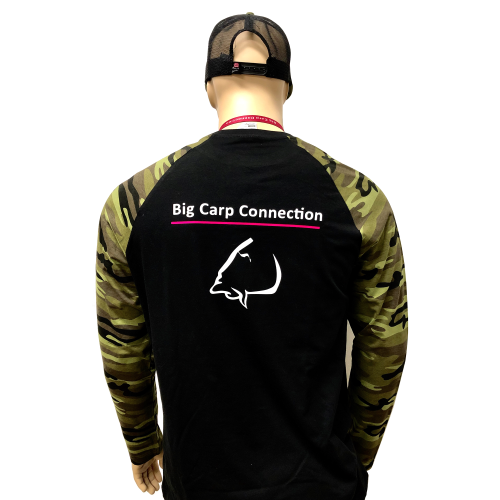 100% bavlněné triko černé barvy, maskáčové rukávy, na zádech motiv kapří hlavy a slogan firmy LK Baits: „spojení s velkými kapry“ a logo LK Baits na prsou.