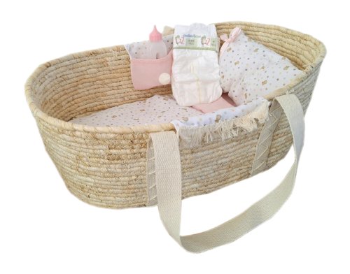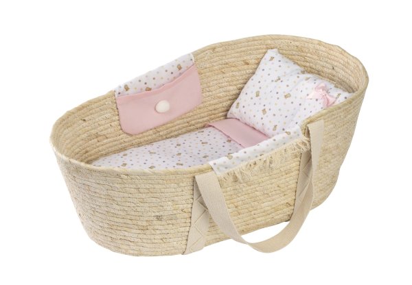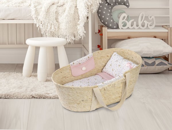 Mojžíšův košík Llorens pro panenky a miminka s povlečením, udělá radost každé malé mamince, která chce mít svou panenku či miminko vždy po ruce. Na obou stranách košíku jsou látkové kapsičky. Ozdobná peřinka s polštářem a matrací je nejenom krásným doplňkem tohoto přenosného košíku, ale také nepostradatelnou výbavou každé holčičky, která si hraje s panenkami. Hrajte si, procházejte se, houpejte a uspávejte, prostě si užívejte svou hru naplno. Košík je určený pro panenky velikosti 40-45 cm, ale velmi dobře může posloužit i jako místo pro uložení plyšáků či jiných hraček a zdobit tak dětský pokojík. Součástí košíku je také lahvička na hraní pro panenky plnitelná vodou a jednorázová plenka. Košík je ručně tkaný ze sušených kukuřičných listů. Jedná se tedy o ekologický výrobek, vyrobený ze 100% přírodních materiálů. Při zašpinění otřete vlhkým hadříkem a ihned osušte. Rozměry košíku: 51 x 31 x 20,4 cm (d x š x v). Vyrobeno ve Španělsku - Onil. Baleno v igelitovém obalu. Doporučený věk od 3 let.