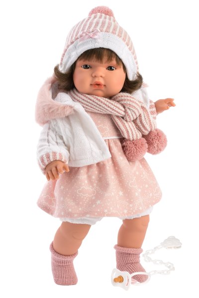 Mluvící a plačící panenka (po vyjmutí pojistky ihned funkční) s měkkým látkovým tělem a s vlásky po celé hlavě. Hlava a končetiny jsou vyrobené z kvalitního měkčeného vinylu. Po vytažení dudlíku z úst začne panenka říkat „mama“, „papa“ a vydávat reálný zvuk plačícího dítěte, který lze utišit opět magnetickým dudlíkem. Velikost panenky 38 cm. Ručně vyrobeno ve Španělsku, baleno v igelitovém obalu. Doporučený věk od 3 let. Tento model je bez oblečení a proto doporučujeme k panence dokoupit originální oblečení z nabídky Llorens pro panenky velikosti 38 cm. Součástí balení je 3 x knoflíková baterie LR44 s návodem na její výměnu. Baterie jsou spotřební zboží a proto jejich vybití není důvodem k reklamaci panenky.