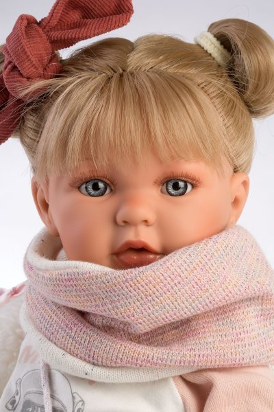 Mluvící a plačící panenka (po vyjmutí pojistky ihned funkční) s měkkým látkovým tělem a s vlásky po celé hlavě. Hlava a končetiny jsou vyrobené z kvalitního měkčeného vinylu. Po vytažení dudlíku z úst začne panenka říkat „mama“, „papa“ a vydávat reálný zvuk plačícího dítěte, který lze utišit opět magnetickým dudlíkem. Velikost panenky 42 cm. Ručně vyrobeno ve Španělsku, baleno v dárkové krabici. Doporučený věk od 3 let. K panence je možné dokoupit další originální oblečení z nabídky Llorens pro panenky velikosti 42 cm. Součástí balení je 3 x knoflíková baterie LR44 s návodem na její výměnu. Baterie jsou spotřební zboží a proto jejich vybití není důvodem k reklamaci panenky.
