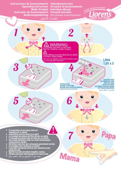 Mrkací a mluvící miminko s měkkým látkovým tělem, které po zatlačení na hrudník začne říkat „mama“, „papa“ a vydávat reálný zvuk plačícího miminka. Ruce a nohy jsou k tělu přichyceny kloubem. Miminko je polohovací a může i sedět. Dudlík v balení slouží pouze jako doplněk. Velikost 42 cm. Ručně vyrobeno ve Španělsku, baleno v dárkové krabici. Doporučený věk od 3 let. K miminku je možné dokoupit další originální oblečení z nabídky Llorens pro miminka NEW BORN velikosti 40-42 cm nebo 43-45 cm. Součástí balení je 3 x knoflíková baterie LR44 s návodem na její výměnu. Baterie jsou spotřební zboží a proto jejich vybití není důvodem k reklamaci panenky.
