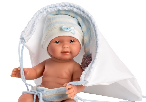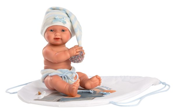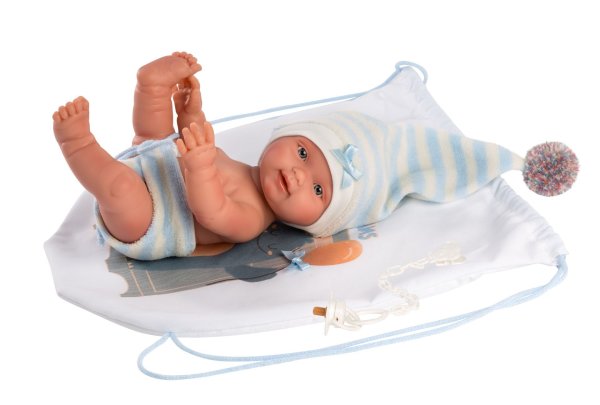 3dílný set: 2 kusy oblečení a batůžek pro panenku miminko NEW BORN Llorens velikosti 26 cm. Vyrobeno ručně ve Španělsku, baleno v igelitovém obalu s plastovým ramínkem. Doporučený věk od 3 let.