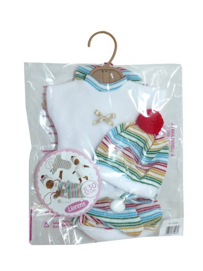 3dílný obleček včetně přenosného vaku na suchý zip pro panenku miminko Llorens velikosti 30 cm. Vyrobeno ručně ve Španělsku, baleno v igelitovém obalu s plastovým ramínkem. Doporučený věk od 3 let.