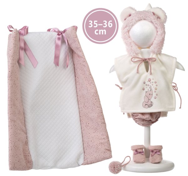 3dílný obleček s ozdobnou přebalovací podložkou a bambulkou pro panenku miminko NEW BORN Llorens velikosti 35-36 cm. Vyrobeno ručně ve Španělsku, baleno v igelitovém obalu s plastovým ramínkem. Doporučený věk od 3 let.