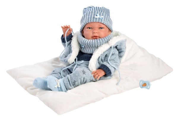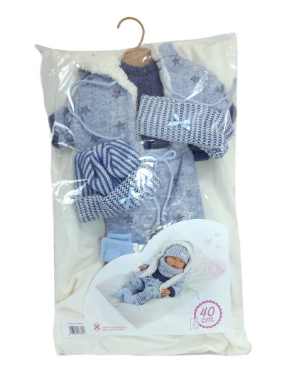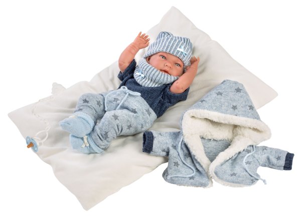 6dílný obleček s oboustranným polštářem využitelným jako podložka pro panenku miminko NEW BORN Llorens velikosti 40-42 cm. Vyrobeno ručně ve Španělsku, baleno v igelitovém obalu s plastovým ramínkem. Doporučený věk od 3 let.