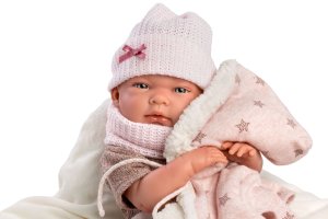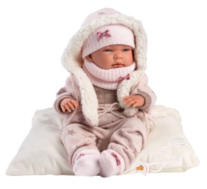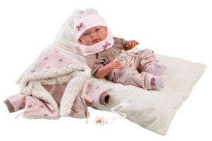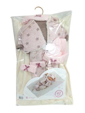 6dílný obleček s oboustranným polštářem využitelným jako podložka pro panenku miminko NEW BORN Llorens velikosti 40-42 cm. Vyrobeno ručně ve Španělsku, baleno v igelitovém obalu s plastovým ramínkem. Doporučený věk od 3 let.