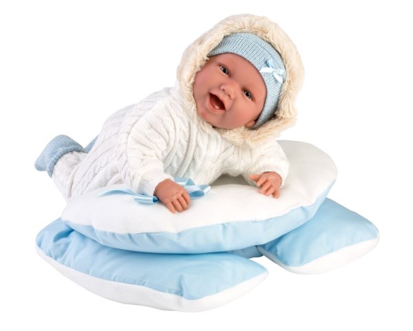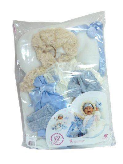 3dílný obleček s ozdobným kapesníčkem a s podložkou s mašličkou a popruhy, kterou lze využít jako židličku pro panenku miminko NEW BORN Llorens velikosti 40-42 cm. Vyrobeno ručně ve Španělsku, baleno v igelitovém obalu s plastovým ramínkem. Doporučený věk od 3 let.