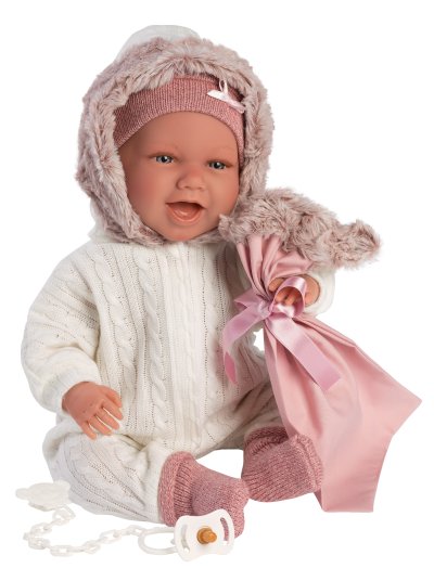 3dílný obleček s ozdobným kapesníčkem a s podložkou s mašličkou a popruhy, kterou lze využít jako židličku pro panenku miminko NEW BORN Llorens velikosti 40-42 cm. Vyrobeno ručně ve Španělsku, baleno v igelitovém obalu s plastovým ramínkem. Doporučený věk od 3 let.