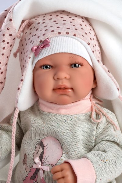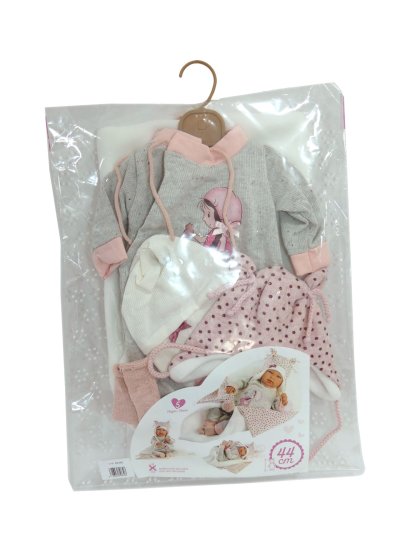 4dílný obleček s ozdobnou dečkou s bambulí na zavázání pro panenku miminko NEW BORN Llorens velikosti 43-44 cm. Vyrobeno ručně ve Španělsku, baleno v igelitovém obalu s plastovým ramínkem. Doporučený věk od 3 let.