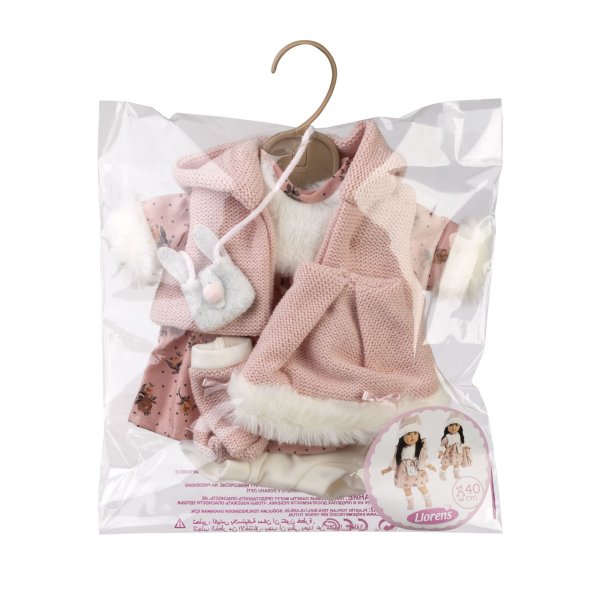 5dílný obleček s kabelkou pro panenku Llorens velikosti 40 cm. Vyrobeno ručně ve Španělsku, baleno v igelitovém obalu s plastovým ramínkem. Doporučený věk od 3 let.