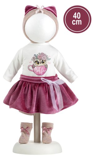 4 kusy oblečení pro panenku Llorens velikosti 40 cm. Vyrobeno ručně ve Španělsku, baleno v igelitovém obalu s plastovým ramínkem. Doporučený věk od 3 let.