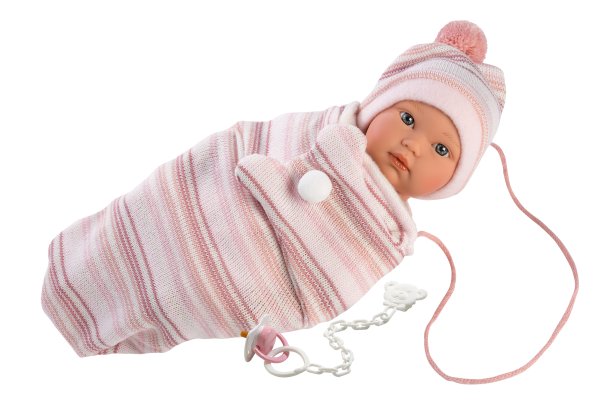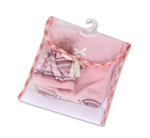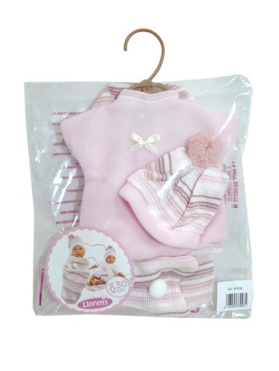 3dílný obleček včetně přenosného vaku na suchý zip pro panenku miminko Llorens velikosti 30 cm. Vyrobeno ručně ve Španělsku, baleno v igelitovém obalu s plastovým ramínkem. Doporučený věk od 3 let.