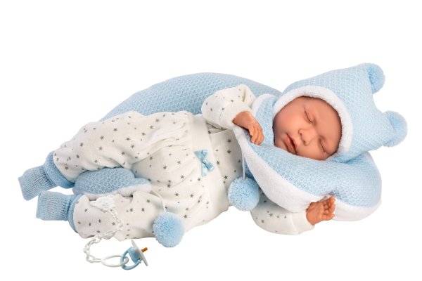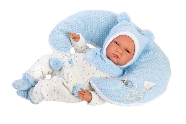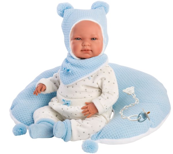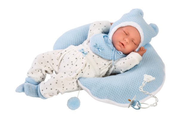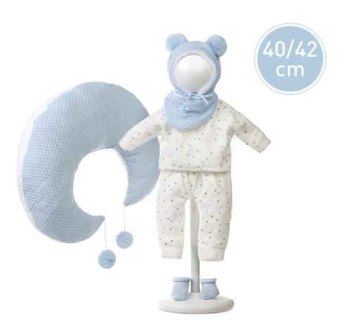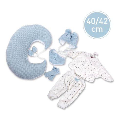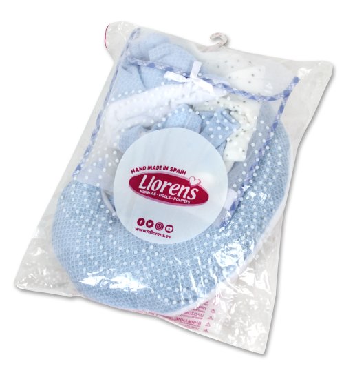 5dílný obleček pro panenku miminko NEW BORN Llorens velikosti 40-42 cm s kojícím polštářem. Vyrobeno ve Španělsku, obleček balen v dárkové ozdobné síťce s kartonovým ramínkem a následně společně s polštářem v igelitovém obalu. Doporučený věk od 3 let.