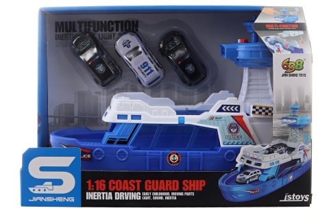 Sada velké lodě a 3 autíček. Materiál plast. Loď je napájena na 3xAG13 baterie - jsou součástí balení. Po zmačknutí tlačítek loď svítí a vydává zvuky. Baleno v otevřené krabici. Rozměry balení 32x23x13 cm. Velikost lodě cca 26x12 cm. Věk 3+