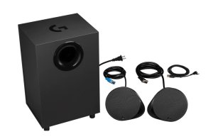 Reproduktorový systém 2.1 s širokospektrým podsvícením LIGHTSYNC RGB reaguje na herní akce a zvuk. Poziční prostorový zvuk DTS:X Ultra vychází z výbušného subwooferu s otvorem vyzařujícím dolů a dvou satelitních reproduktorů s širokoúhlými měniči.