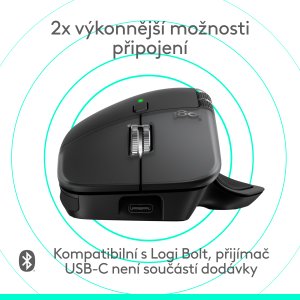Myš podporuje připojení až ke třem zařízením současně přes Bluetooth nebo Logi Bolt. Funkce Logitech Flow umožňuje přenos souborů mezi různými systémy. Nabíjení přes USB-C je rychlé – minuta nabíjení stačí na 3 hodiny provozu.