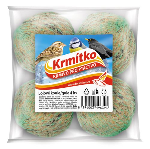 Lojová koule Krmítko je vhodná pro venkovní ptactvo jako doplňkové krmivo. V letních měsících slouží jako příkrm, v zimě při nedostatku potravy jako důležitá část krmiva ptactva. Kouli je třeba umístit na místo chráněné před deštěm. Je v síťce, kterou je možné v případě umístění do krmítka sundat. Skládá se z pšenice, ovse, čiroku, slunečnice a hovězího tuku. V balení jsou 4 lojové koule po 90 gramech.